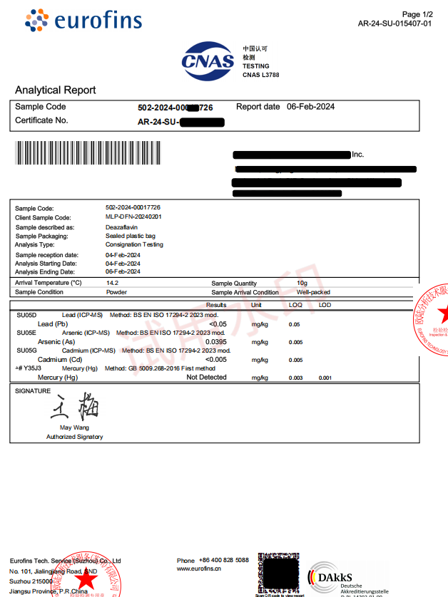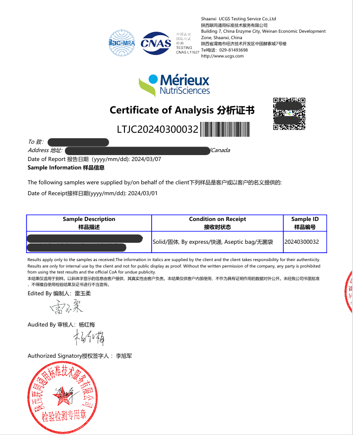 Before the shipment of each batch of goods, samples are taken for inspection. Goods will only be delivered to customers after passing the inspection. Currently, we cooperate with third – party laboratories such as SGS, Eurofins, Métier Testing. In accordance with the quality control system, we conduct re – inspections on products. The inspection items cover a wide range including nutritional components, content, moisture, ash, heavy metals, solvent residues, pesticide residues, protein, microorganisms, etc., all in an all – out effort to help customers avoid quality risks.